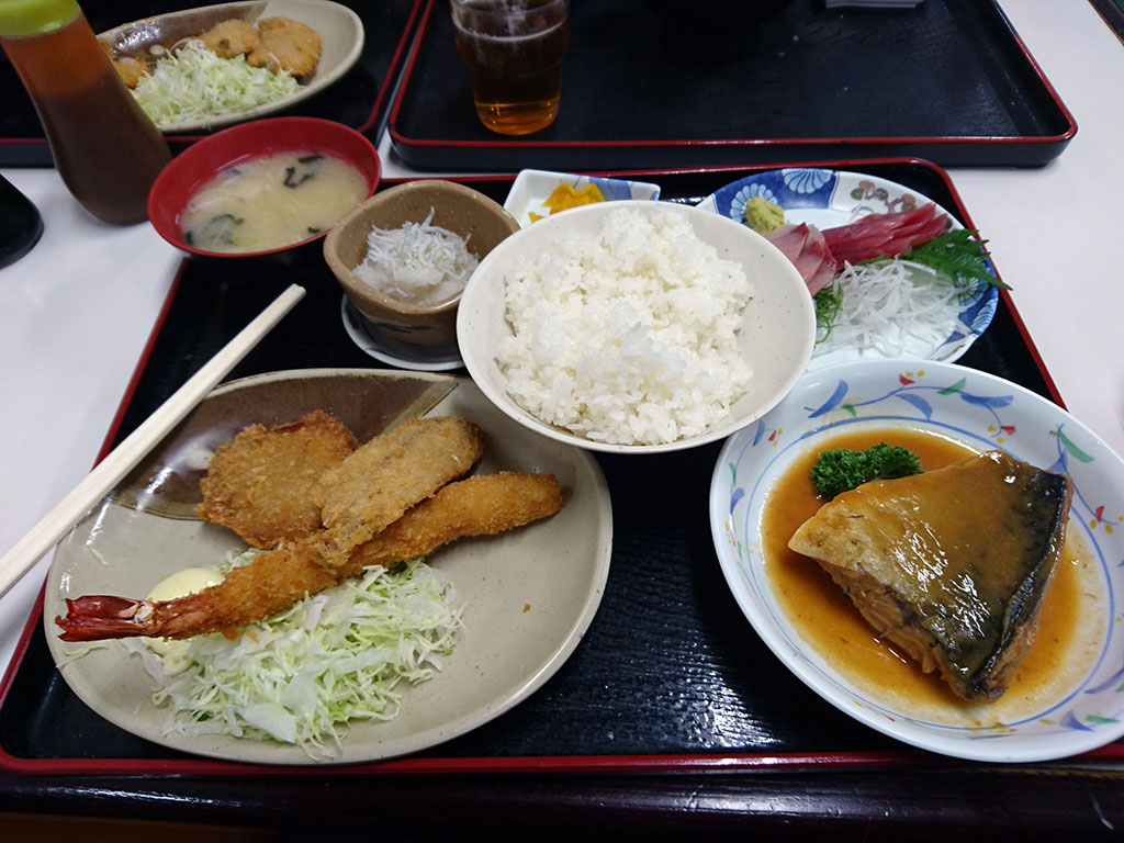 上に上がると予想ほどは人がいなく、1巡目には座れなかったが、2巡目を確保できた。今回は3種食べられるデラックス定食を選択、刺身、フライ、鯖味噌全て美味かった。
